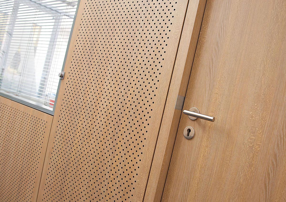 Декоративные перфорированные акустические двери на основе Стекломагниевого листа СМЛ с большим выбором покрытий по каталогу RAL ПВХ HPL и Шпон